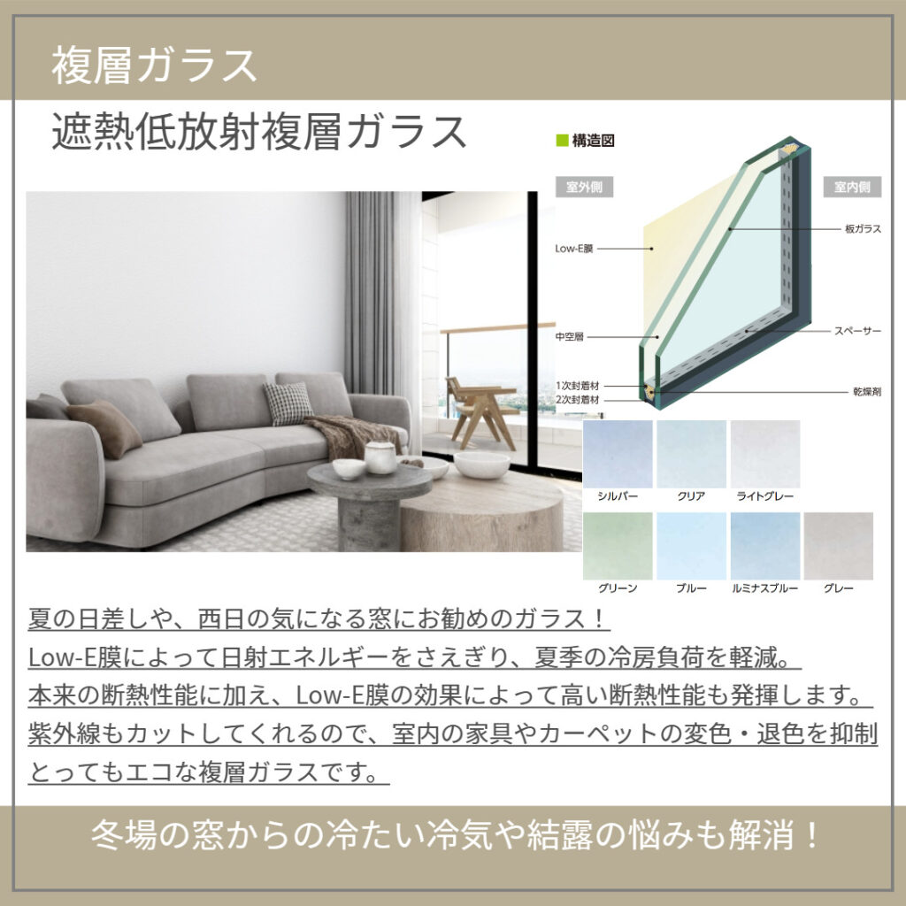 - 室内側と室外側のガラスにLow-E膜と呼ばれる膜をコーティングした板ガラスを使用し、