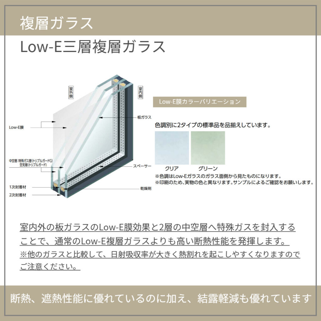 2層の中に断熱性能の高い特殊なガスを入れているので、より高い断熱性能を発揮します。 - 3枚のガラスでできているので、外気の気温が屋内に伝わりにくい為、夏は涼しく過ごせます。