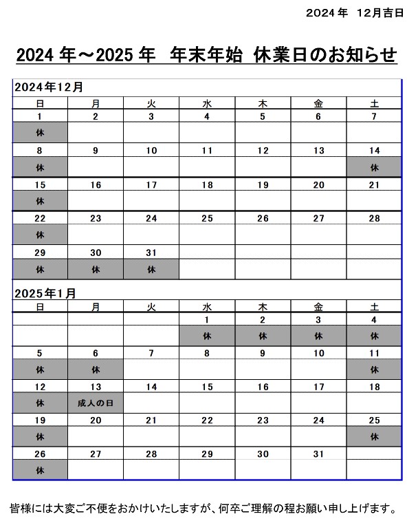 年末年始休業期間:2024年12月29日(日)~2025年1月6日(月)