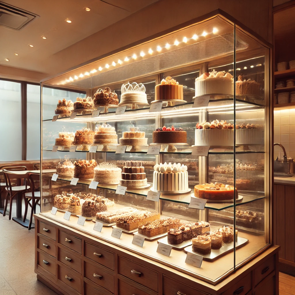 カフェのショーケースでは、軽量で透明度の高いガラスが適しています。食品を美しく見せるためには視認性が重要であり、同時に日常的な使用に適した扱いやすさも考慮する必要があります。