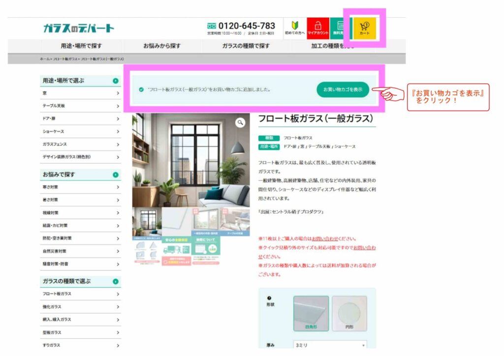 ⑥『お買い物カゴに追加』をクリックすると、サイト上部に『お買い物カゴを表示』