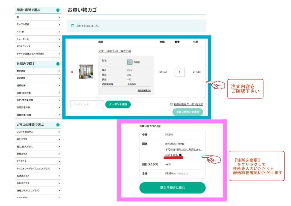 ⑦上部(青枠内)のご注文内容を確認して下さい。