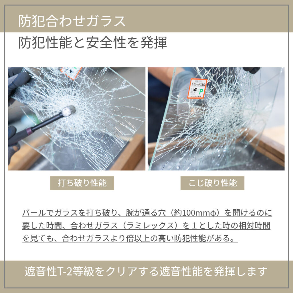 - 強い衝撃を受けてガラスが破損してもガラス破片が飛散しにくく、安全性にすぐれている