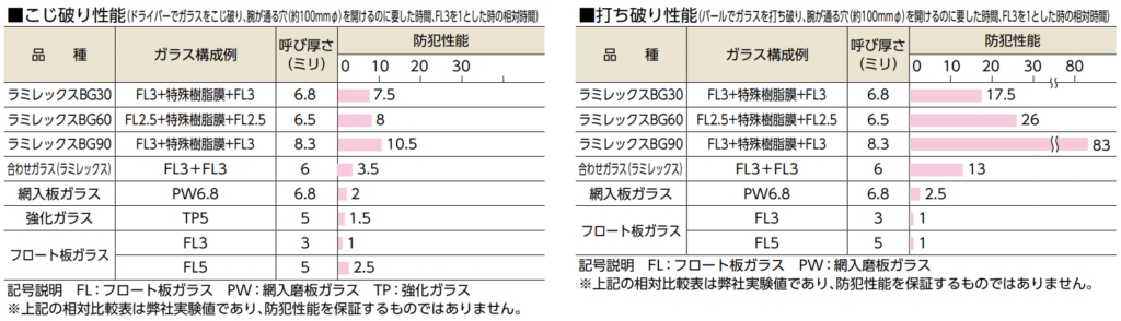 バールでガラスを打ち破り、腕が通る穴(約100㎜φ)を開けるのに要した時間、合わせガラス(ラミレックス)を1とした時の相対時間を見ても、合わせガラスより高い防犯性能がある。