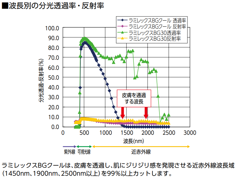 特殊樹脂膜により、近赤外線波長域を99%以上カットし、直射日光を浴びたときに感じる肌のジリジリとした不快感を和らげます。