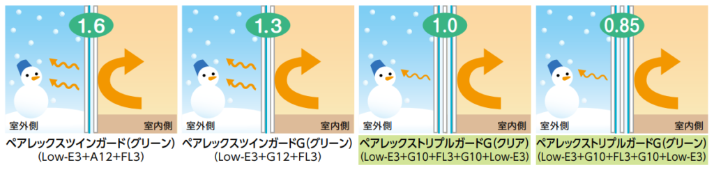 室内外の板ガラスのLow-E膜効果と2層の中空層へ特殊ガスを封入することで通常のLow-E複層ガラスよりも高い断熱性能を発揮します。