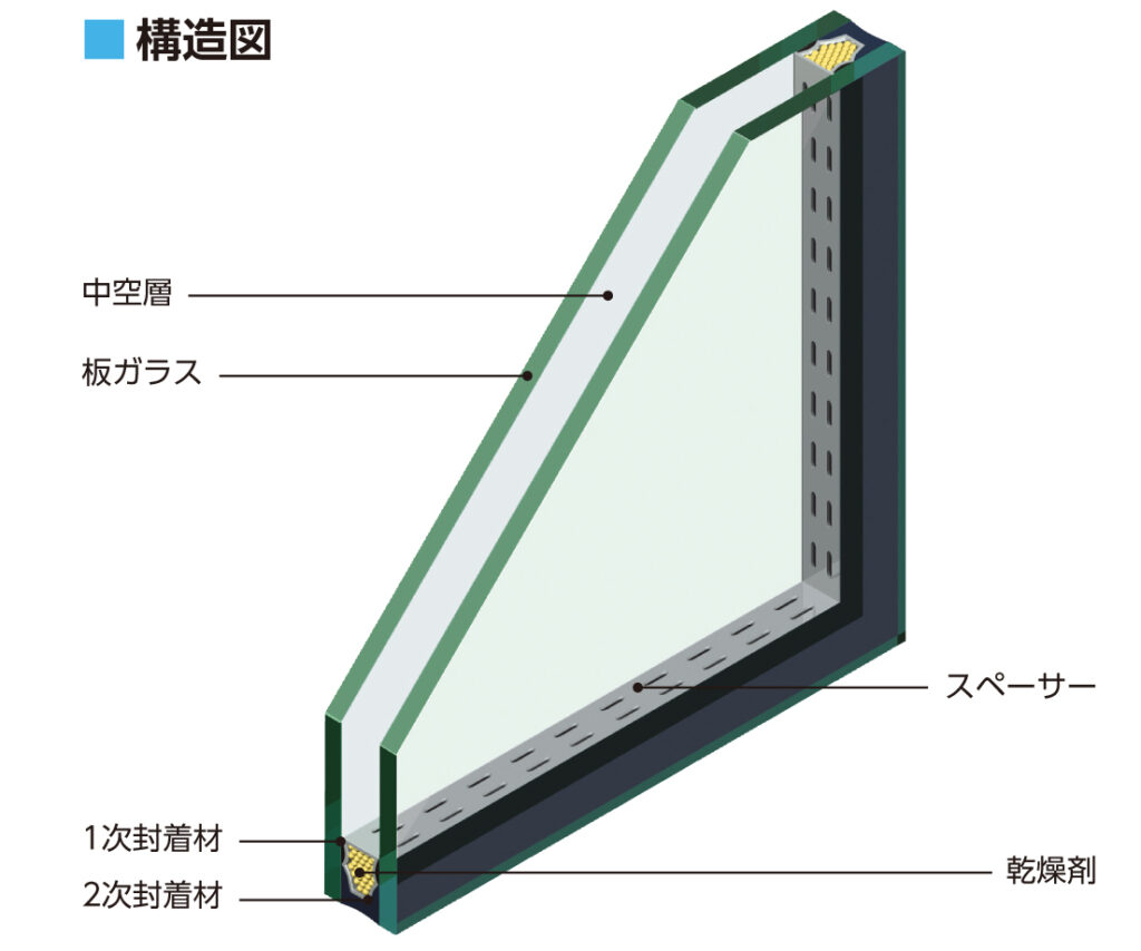 2枚のガラスの中間層の空気によって熱が伝わりにくくなり、断熱効果が得られます。