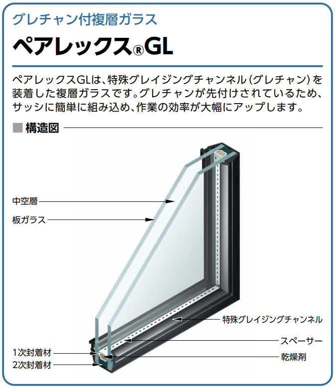 ペアレックスGLは、特殊グレイジングチャンネル(グレチャン)を装着した複層ガラスです。