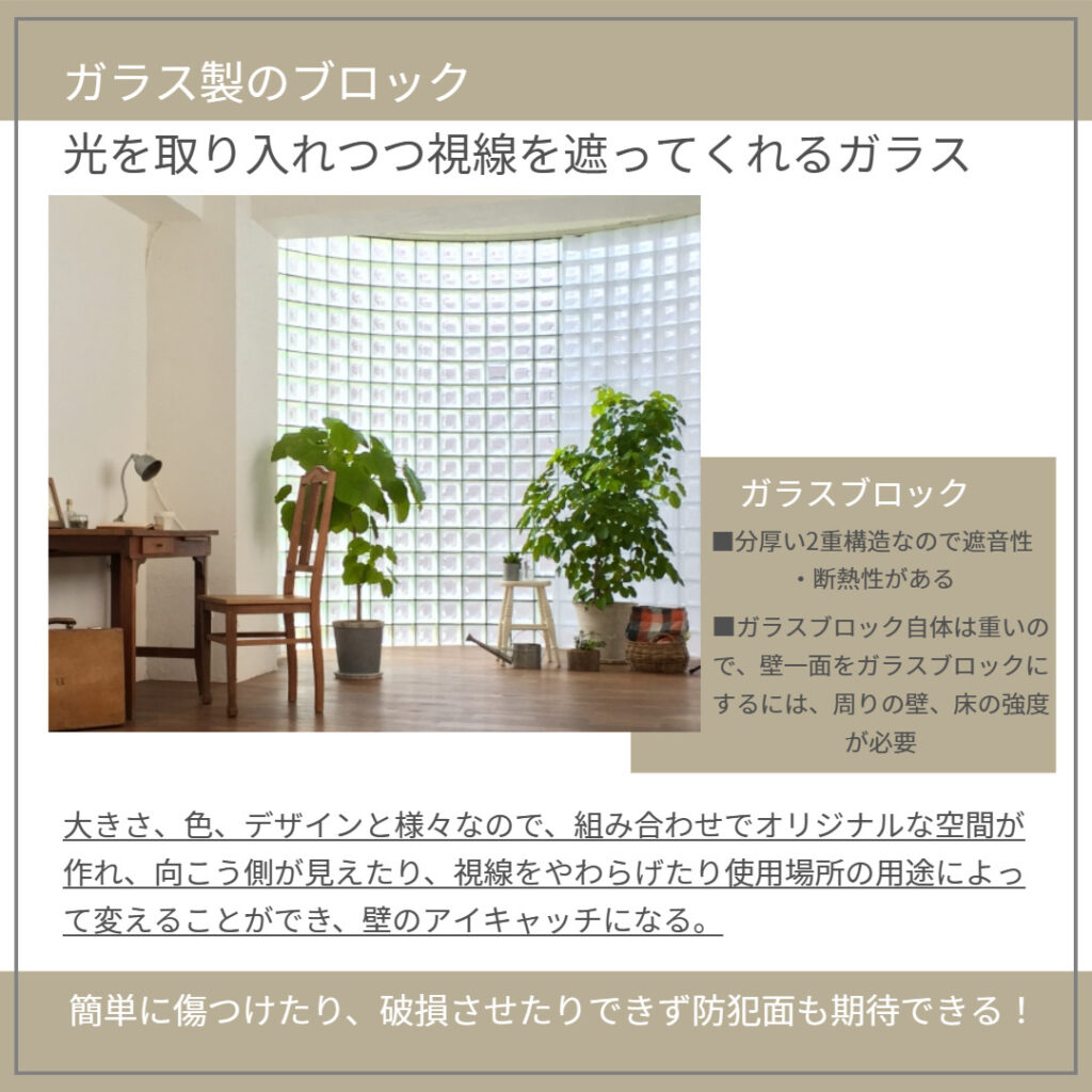 向こう側の景色がみえるガラス、視線をやわらげることができるガラスなど種類が豊富なので、使用場所の用途によって変えることができ、壁のアクセントやアイキャッチになります。