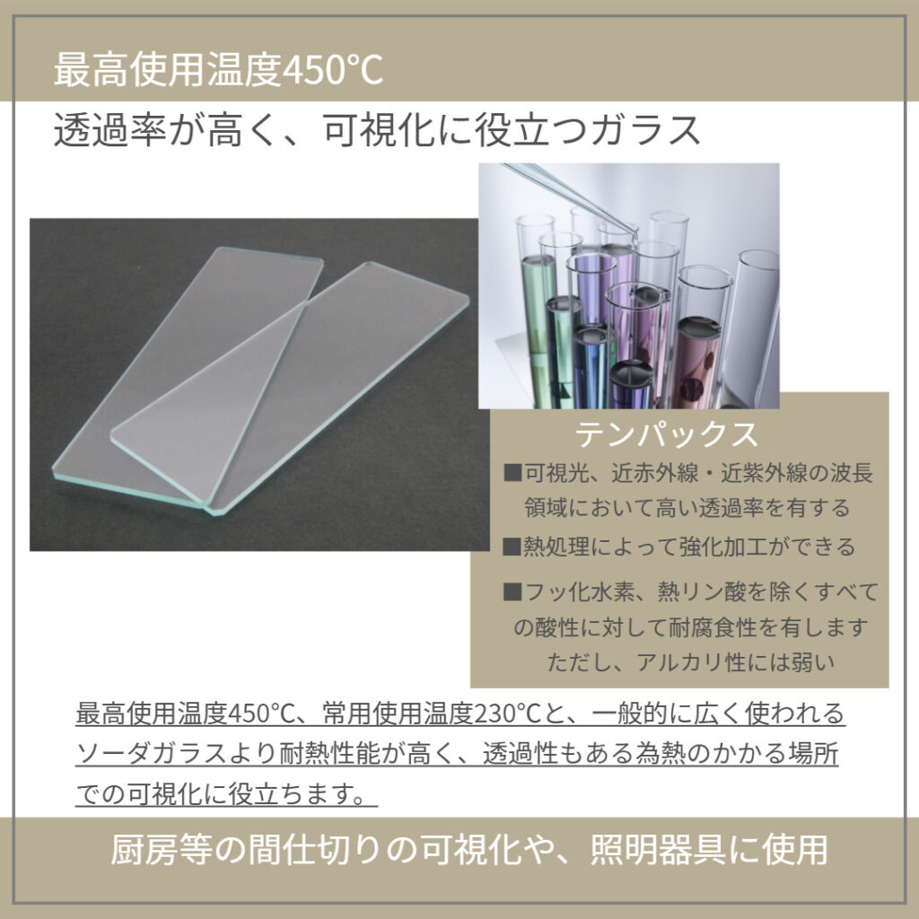 最高使用温度450度、常用使用温度230度と、一般的に広く使われるソーダガラスより耐熱性能が高く、また、透過性もあるため、熱のかかる場所での可視化に役立ちます。