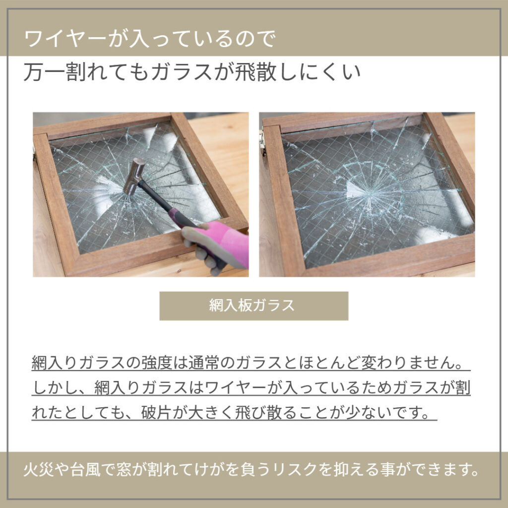 ワイヤーが少ない分、外が見やすいですが割れ落ちやすいです。