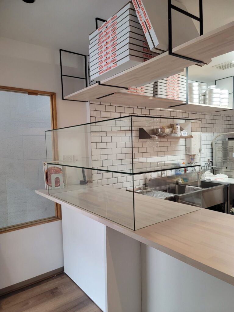 ピザ屋に使用されるショーケースを組立、搬入。板ガラスを材工、組立まで一貫してお任せいただきました。