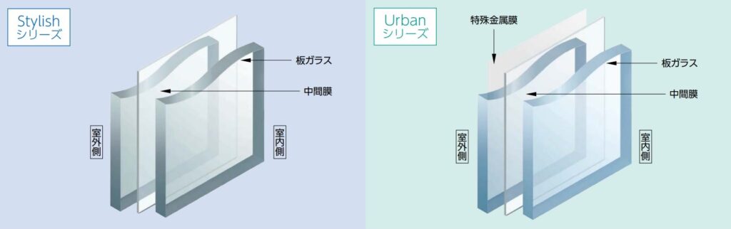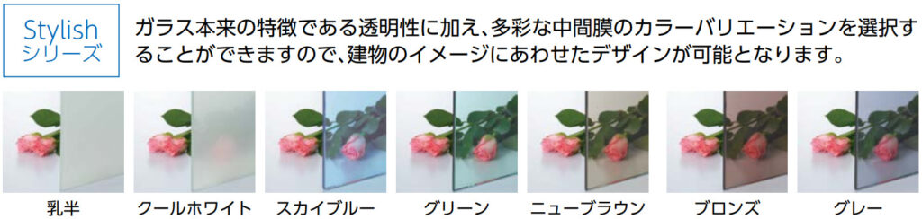 2枚のガラスの中間膜をカラーに変えたり、ミラーガラスの特殊金属膜に変えることにより、日の光は通し、中はさえぎることができる、合わせガラスです。